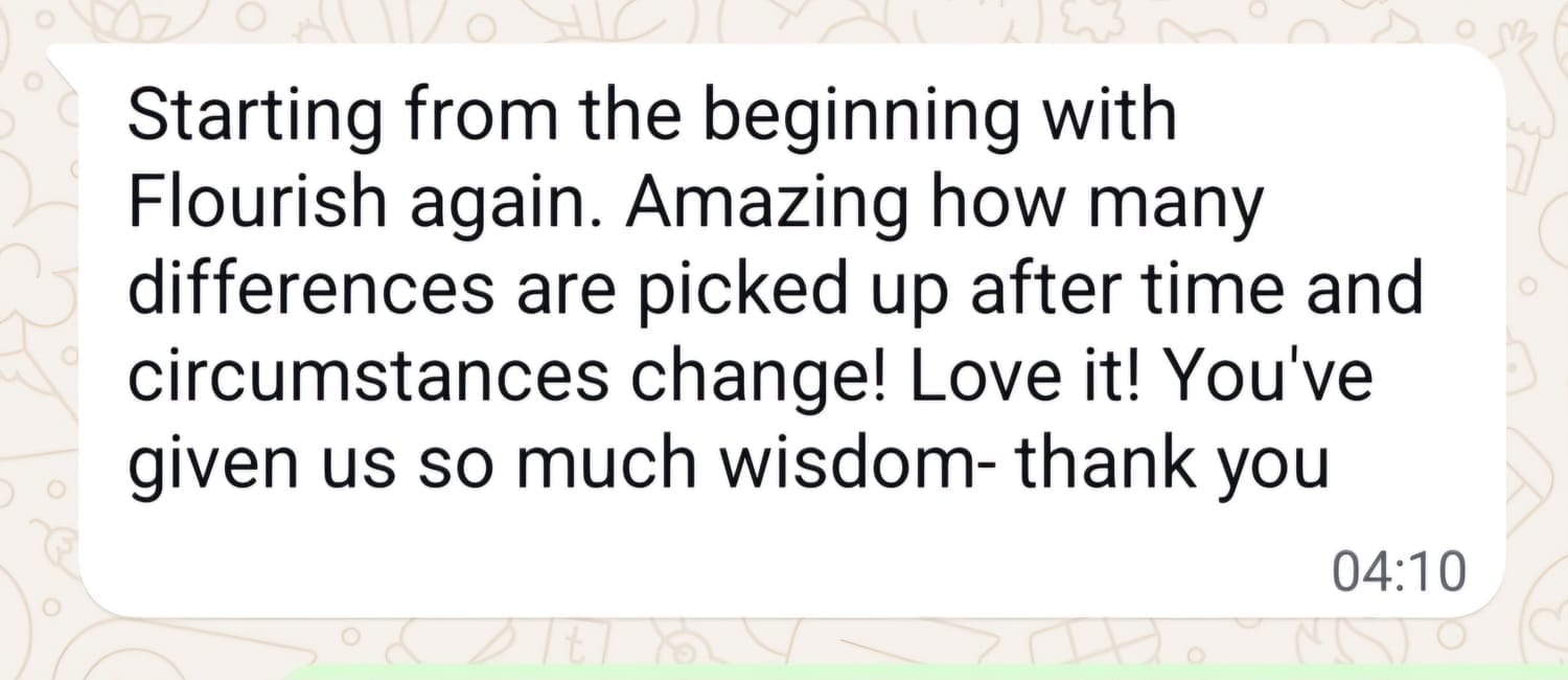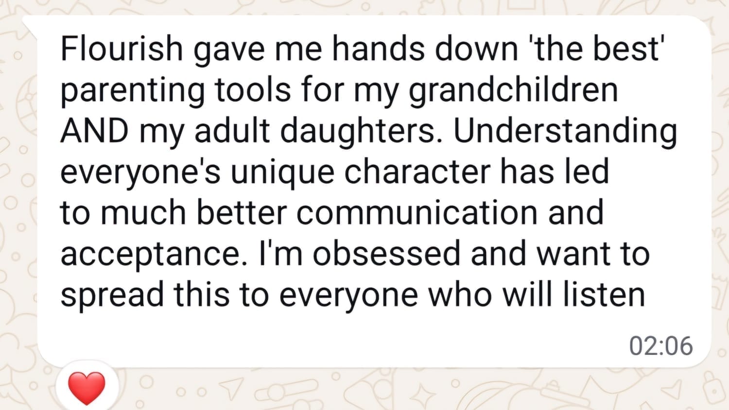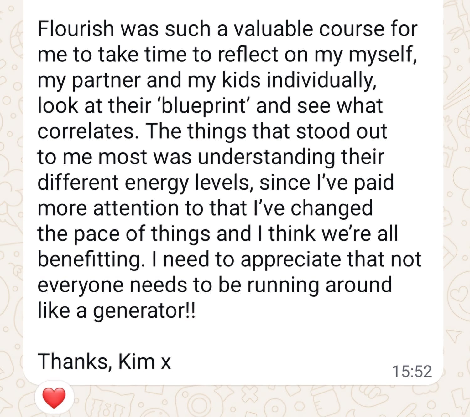 💬 “Flourish was such a valuable course. Understanding my kids’ different energy levels completely changed how we function at home.””