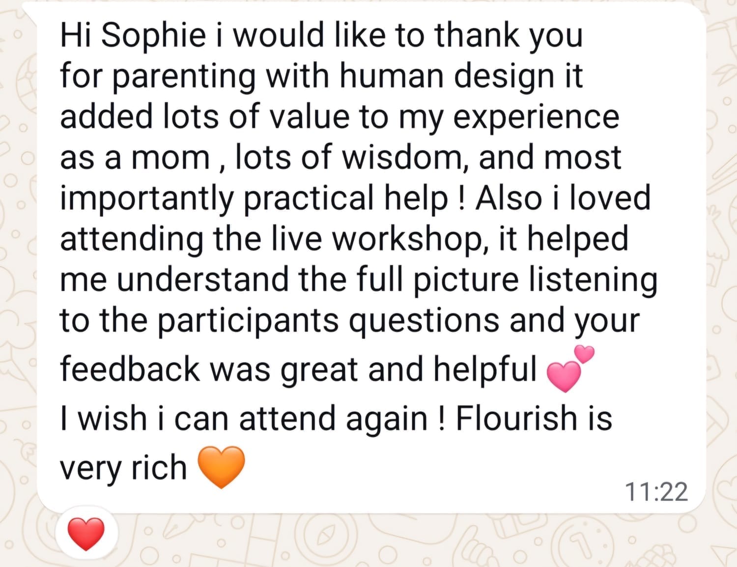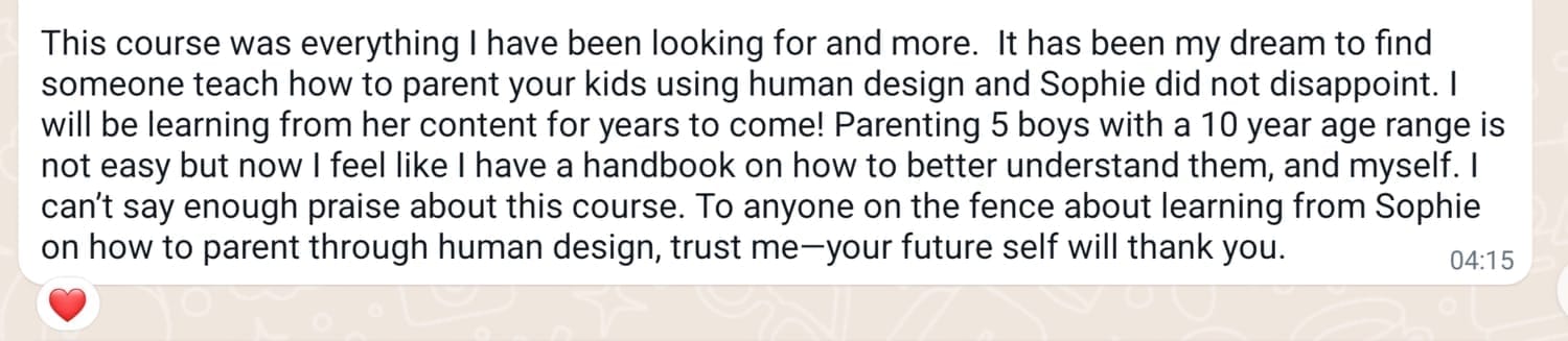 💬 “This course was everything I have been looking for and more. It has been my dream to find someone to teach how to parent your kids using Human Design and Sophie did not disappoint.”