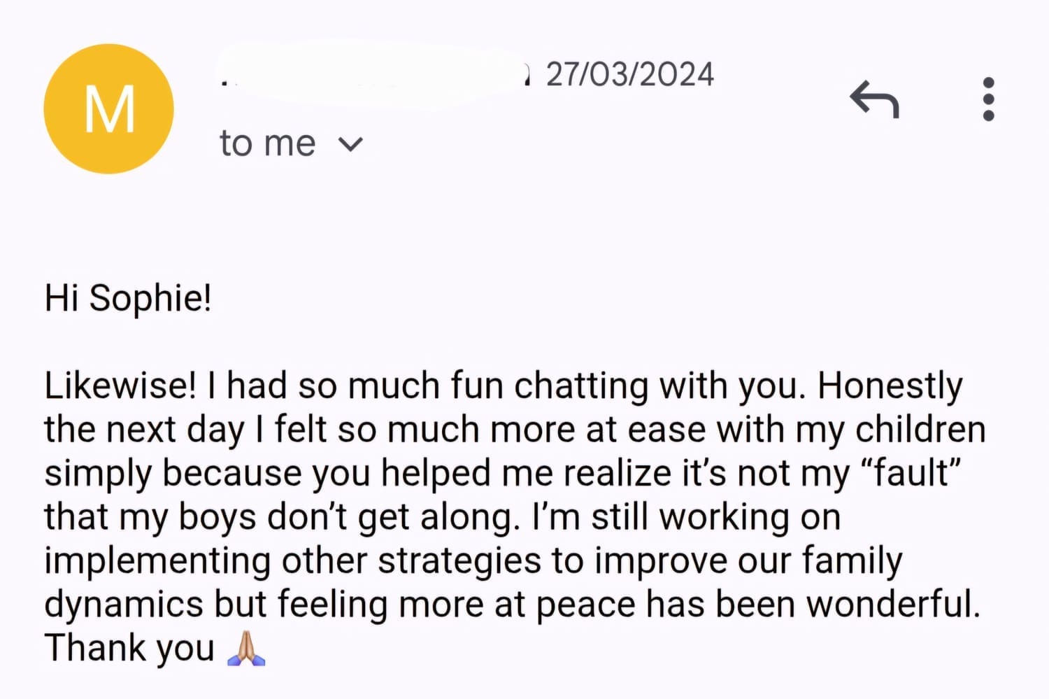💬 “Honestly the next day I felt so much more at ease with my children simply because you helped me realise it’s not my ‘fault’ that my boys don’t get along. Feeling more at peace has been wonderful. Thank you!”